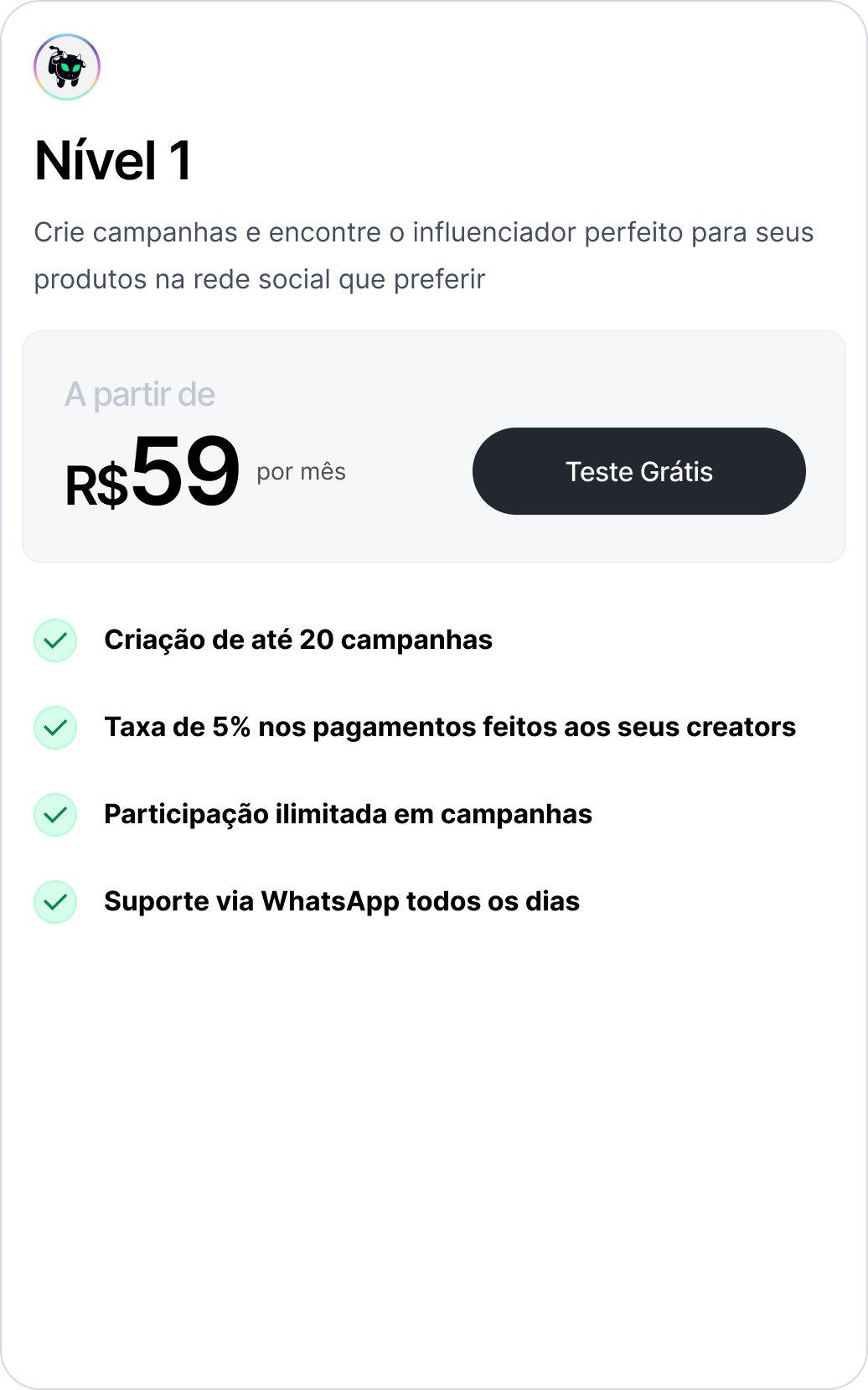 Nível 1: R$59 por mês e criação de até 10 campanhas. Seus influencers pagam uma taxa de 5% nos pagamentos recebidos.
